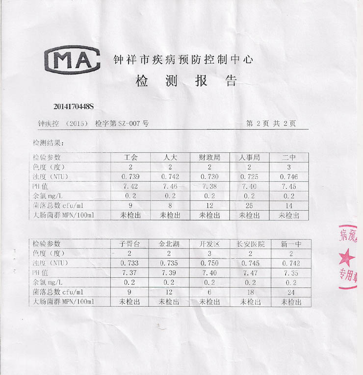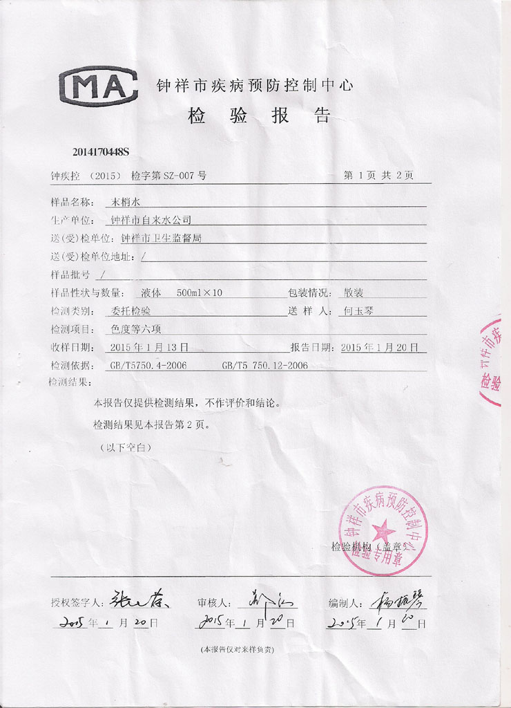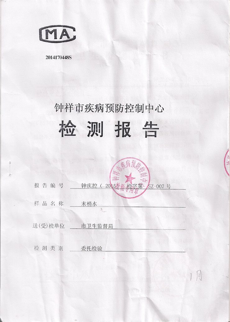 2015年1月20日鐘祥市疾病預(yù)防控制中心檢驗(yàn)報(bào)告(末梢水)