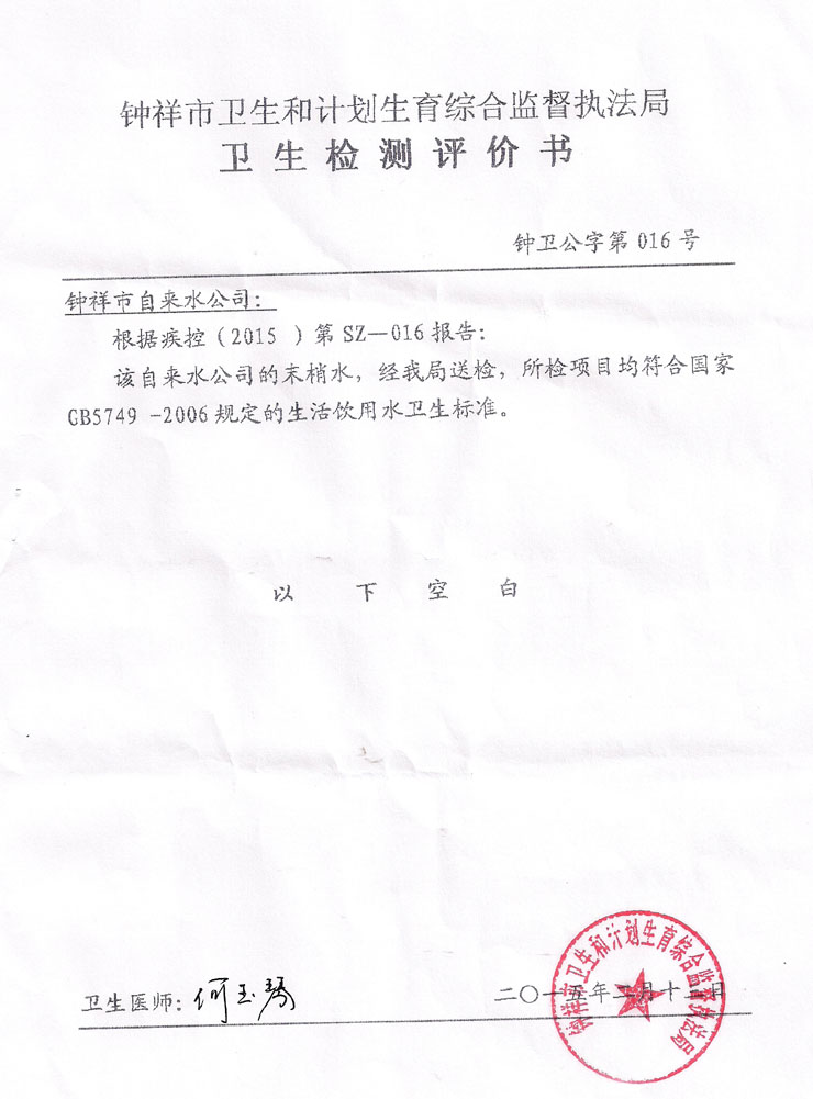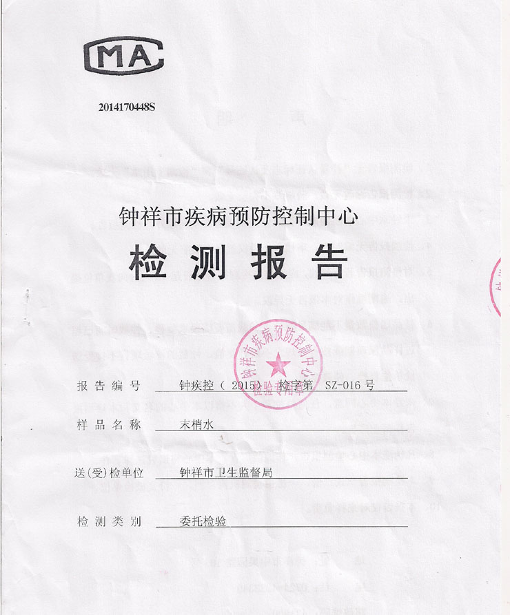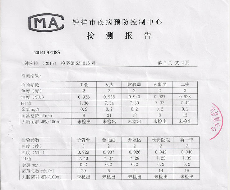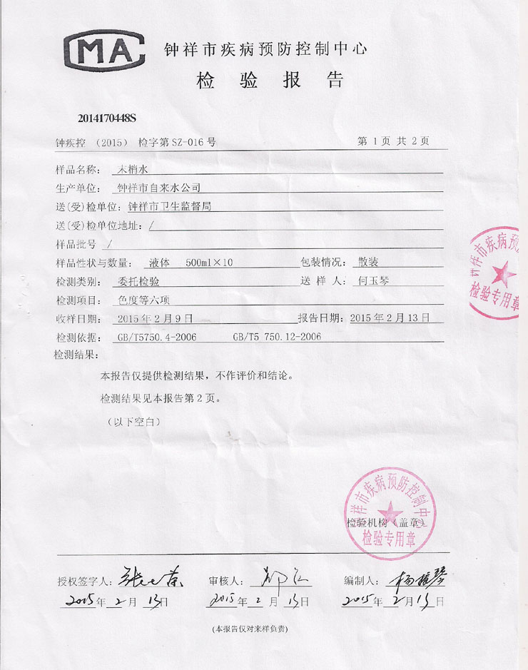 2015年2月13日鐘祥市疾病預(yù)防控制中心檢驗報告(末梢水)