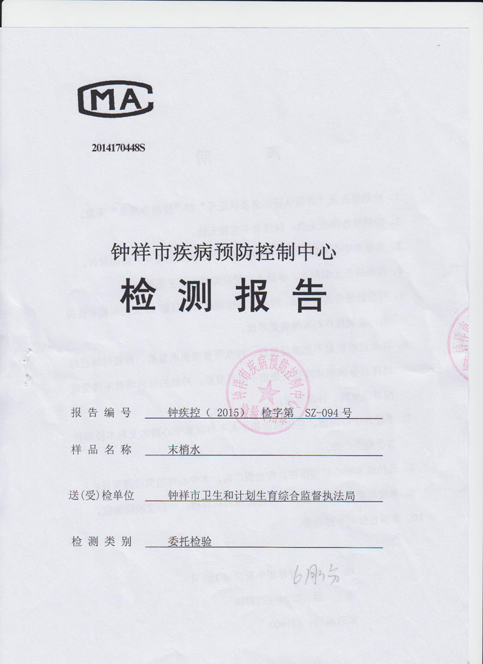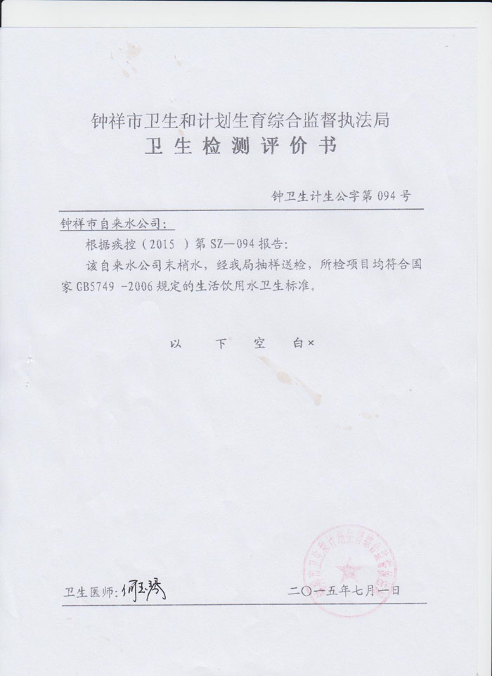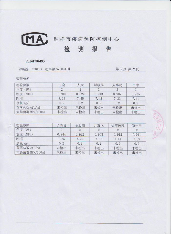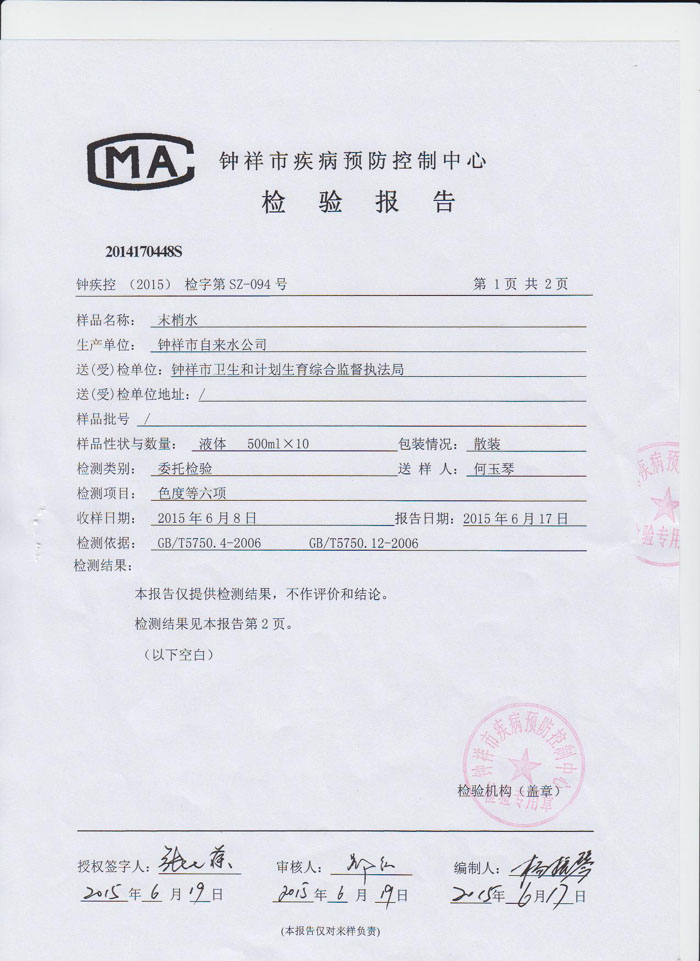2015年6月19日鐘祥市疾病預防控制中心檢驗報告(末梢水)