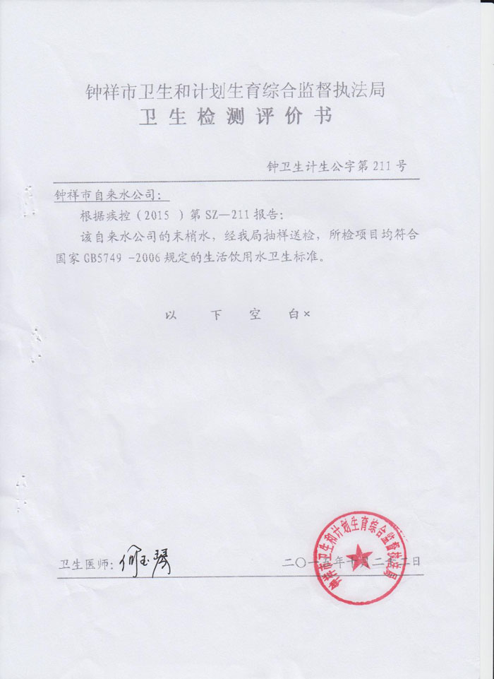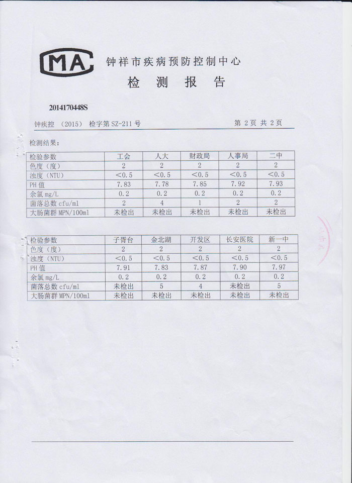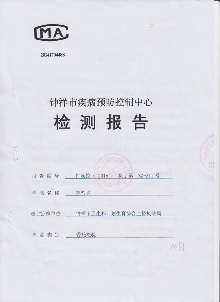 2015年10月22日鐘祥市疾病預防控制中心檢測報告(末梢水)