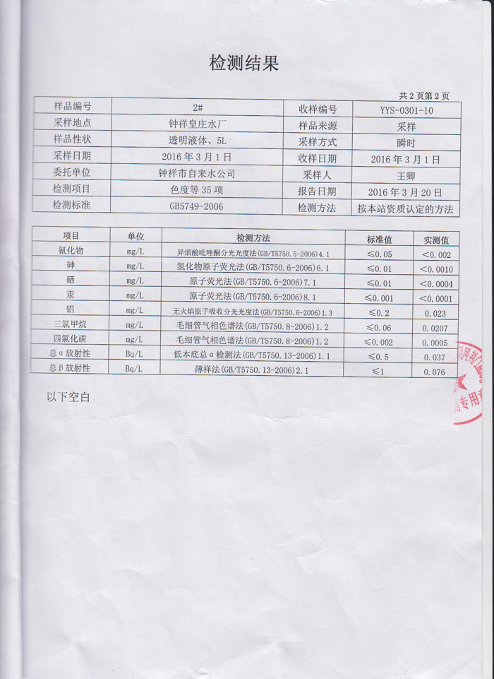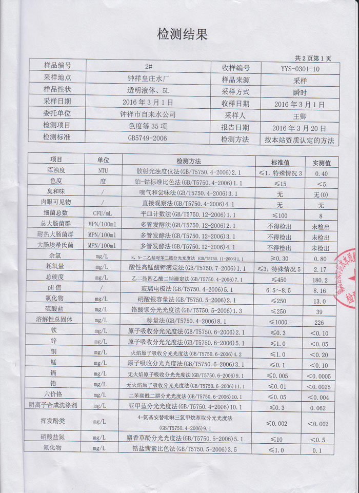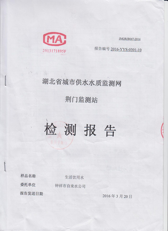 2016年3月20日湖北省城市供水水質(zhì)監(jiān)測網(wǎng)荊門監(jiān)測站監(jiān)測報告(生活飲用水)
