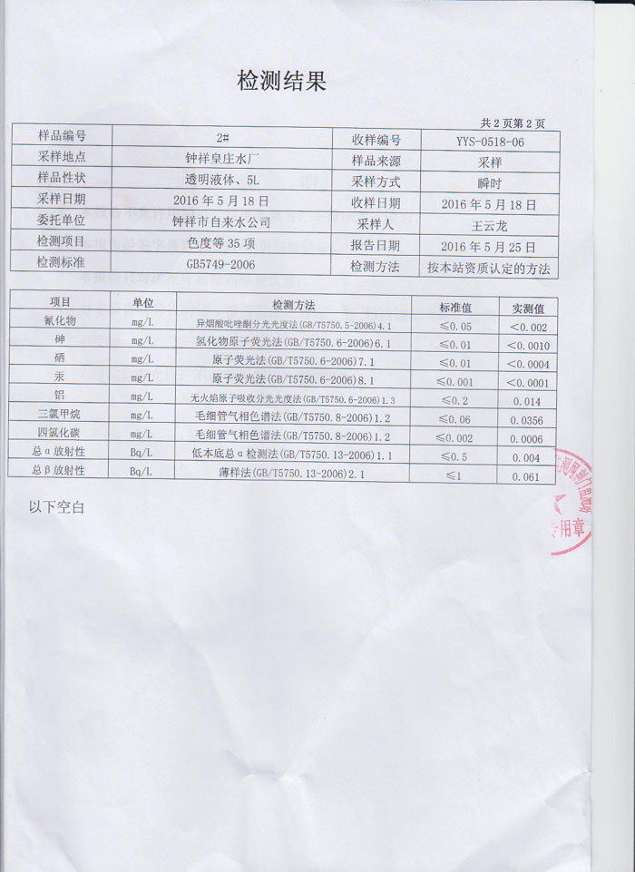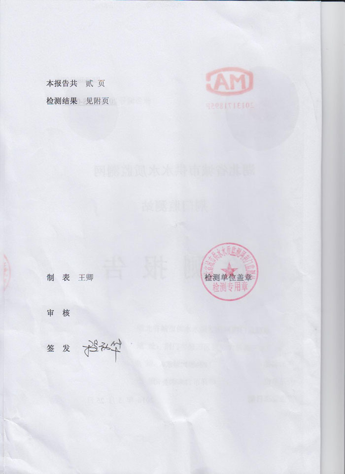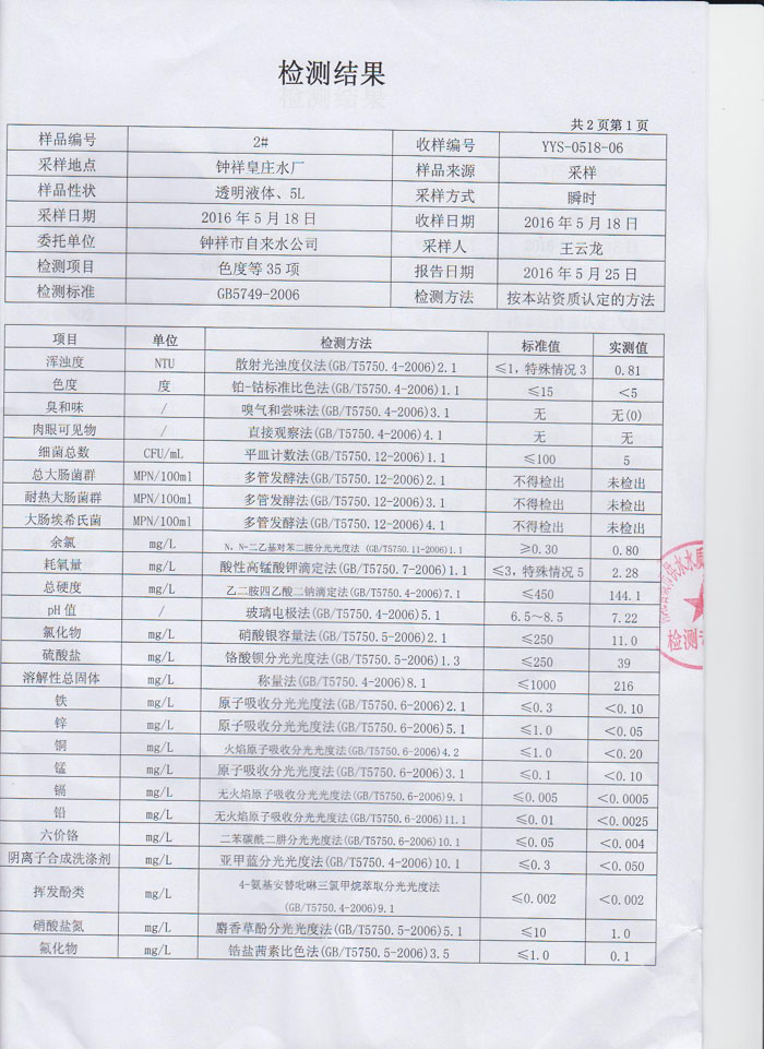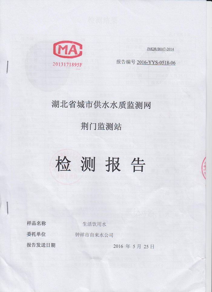 2016年5月25日湖北省城市供水水質(zhì)監(jiān)測(cè)網(wǎng)荊門監(jiān)測(cè)站檢測(cè)報(bào)告(生活飲用水)