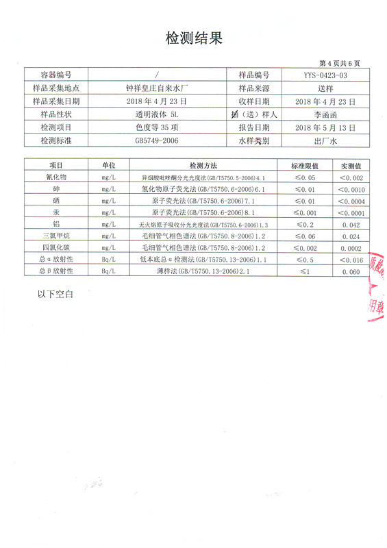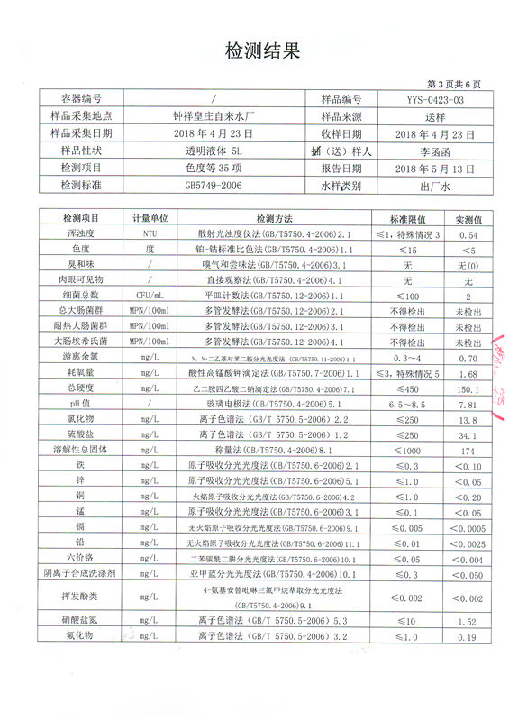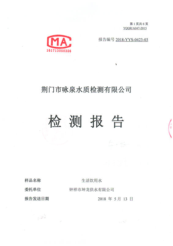 2018年5月13日湖北省城市供水水質(zhì)監(jiān)測(cè)網(wǎng)荊門(mén)監(jiān)測(cè)站檢測(cè)報(bào)告(生活飲用水) |