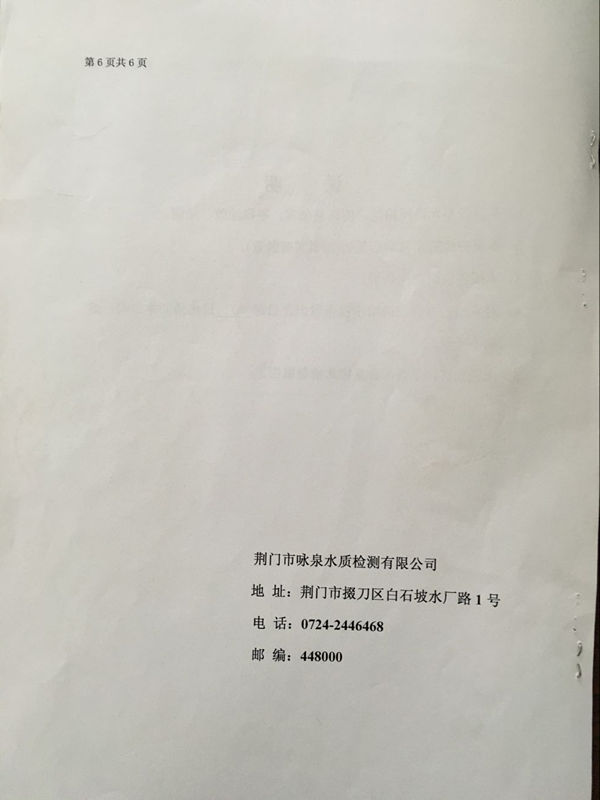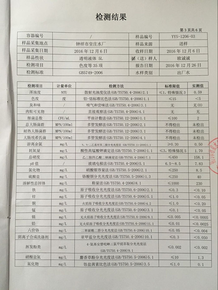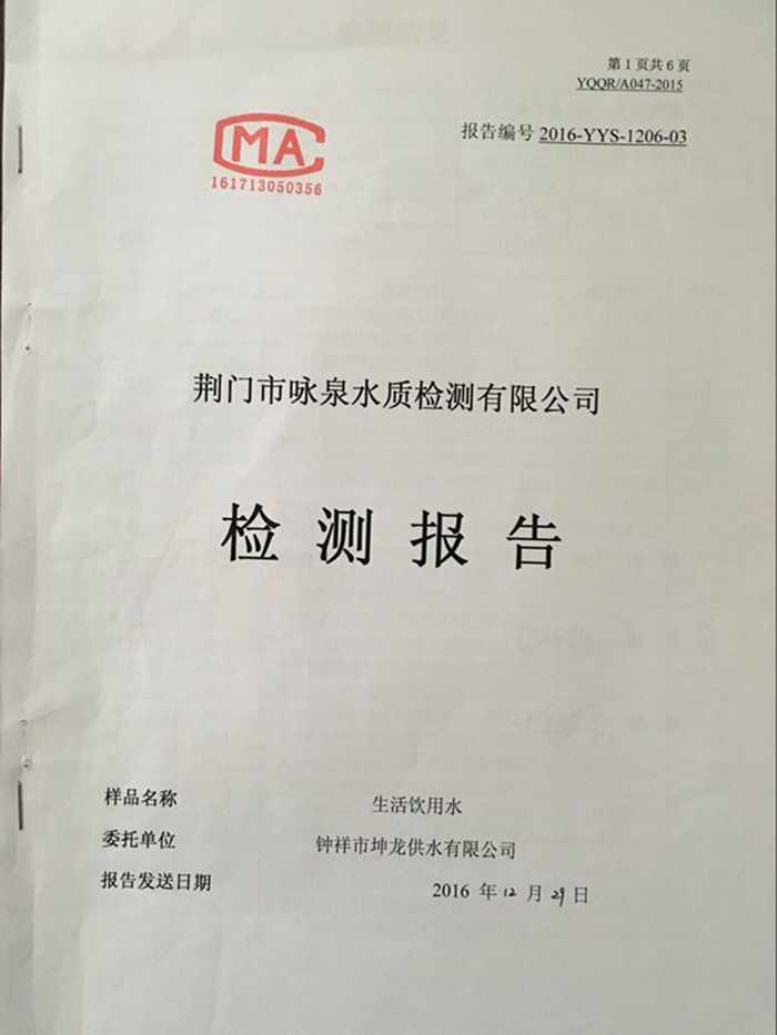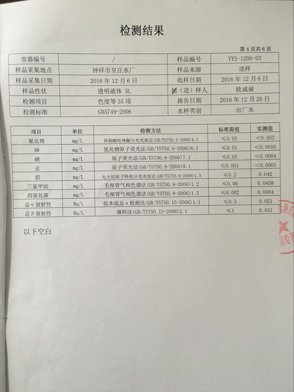 2016年12月29日湖北省城市供水水質(zhì)監(jiān)測網(wǎng)荊門監(jiān)測站檢測報告(生活飲用水)