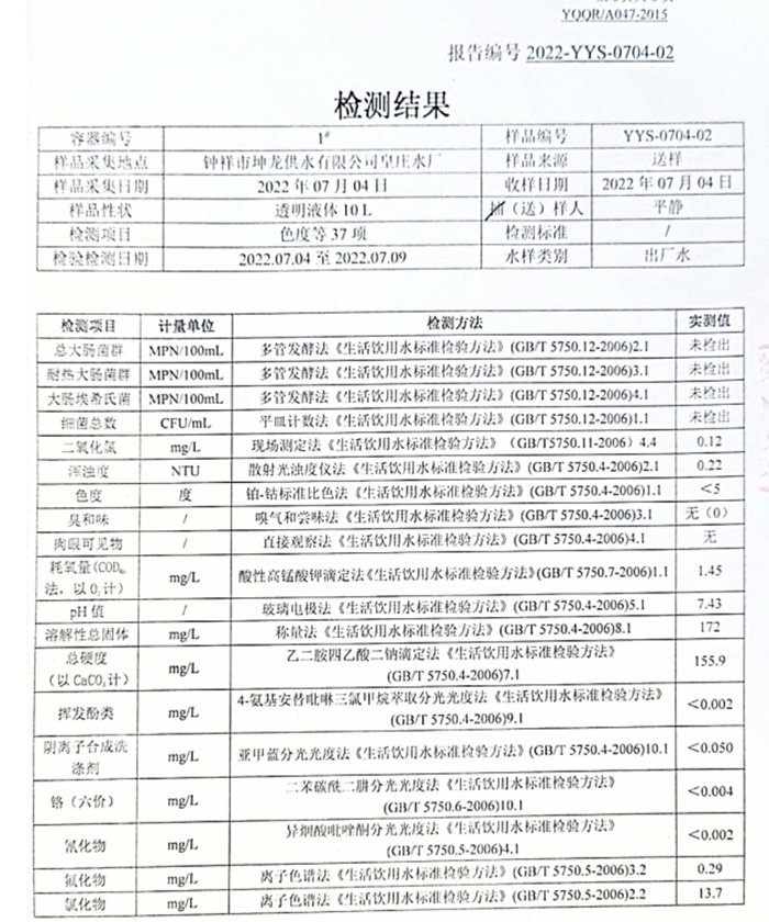 2022年7月4日湖北省城市供水水質(zhì)監(jiān)測(cè)網(wǎng)荊門(mén)監(jiān)測(cè)站檢測(cè)報(bào)告(生活飲用水)