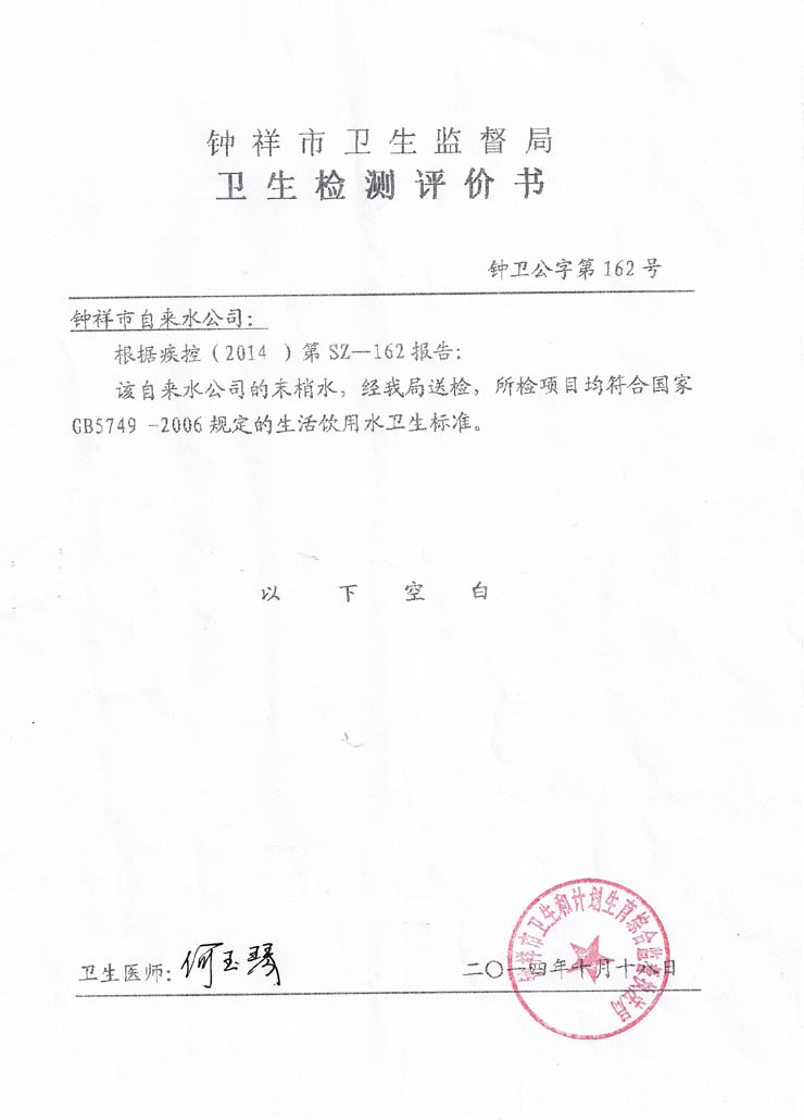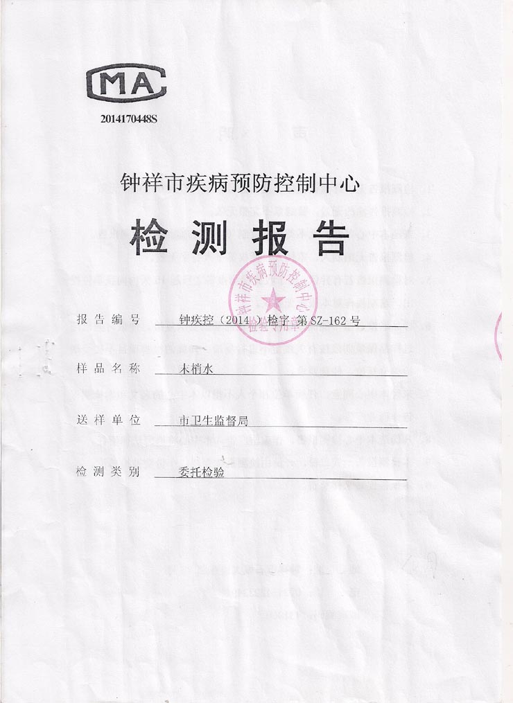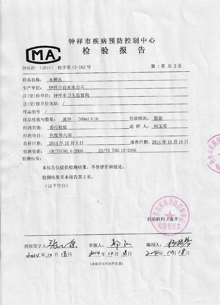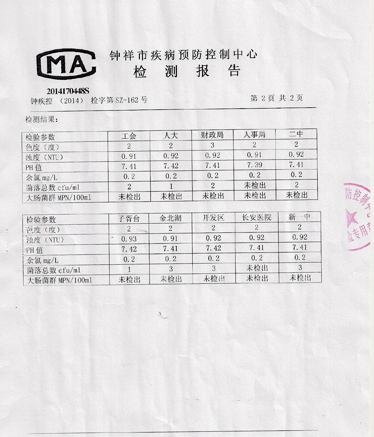 2014年10月18日鐘祥市疾病預防控制中心檢驗報告(末梢水)