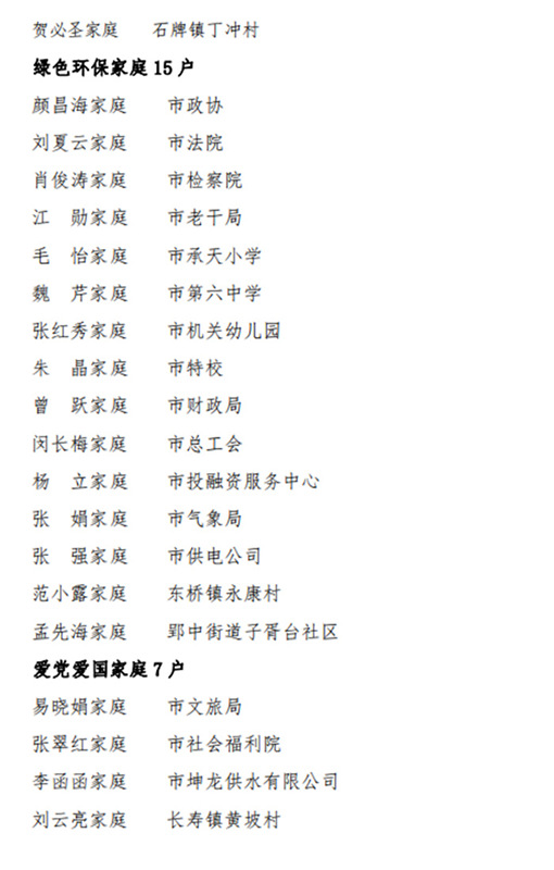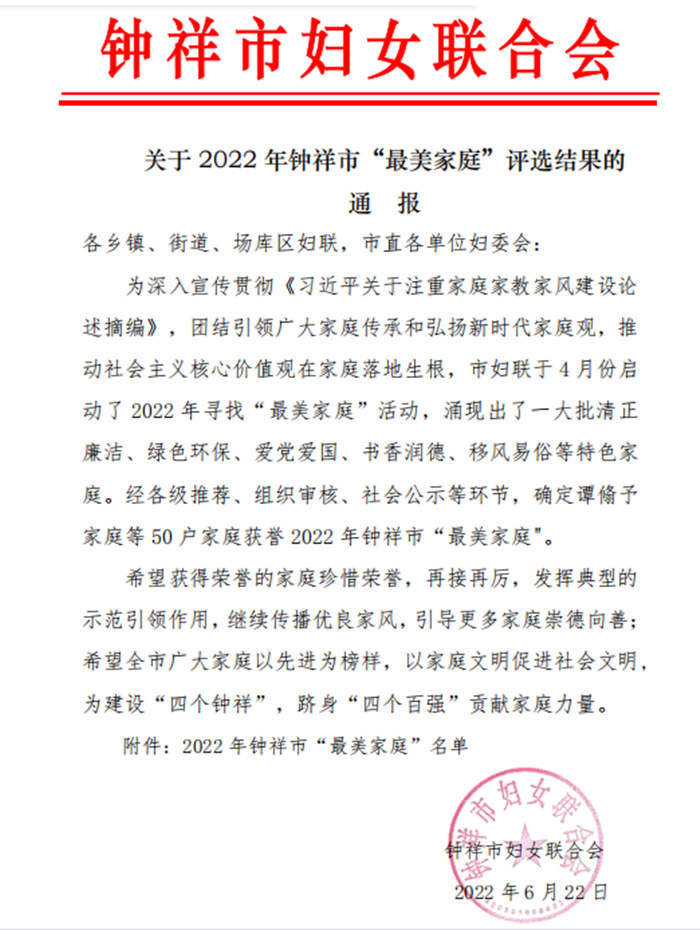 公司董青青家庭和李函函家庭被評為2022年鐘祥市最美家庭
