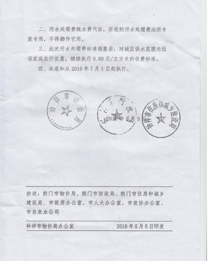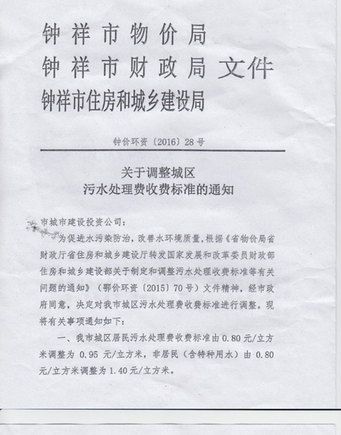 根據(jù)市物價(jià)局鐘價(jià)環(huán)資【2016】28號(hào)文件,我市城市污水處理費(fèi)由我公司在收取水費(fèi)時(shí)按銷售量一并征收。