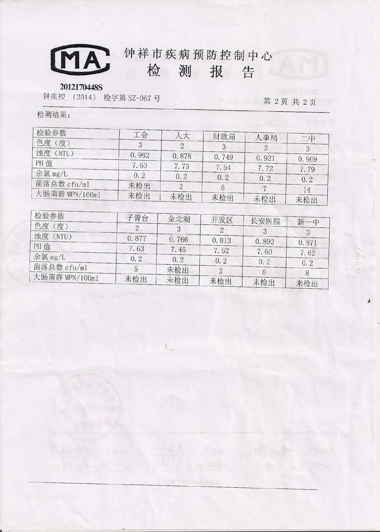 2014年6月18日鐘祥市疾病預防控制中心檢驗報告(末梢水)